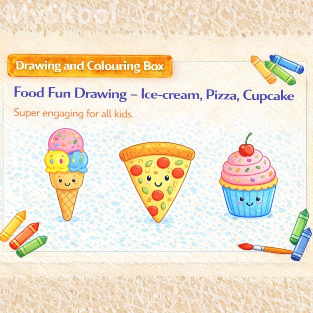 The objective is to use familiar food items to build drawing interest. Students practise shape control and detailing. Creativity is encouraged through decoration. Confidence grows through relatable subjects. Observation improves.