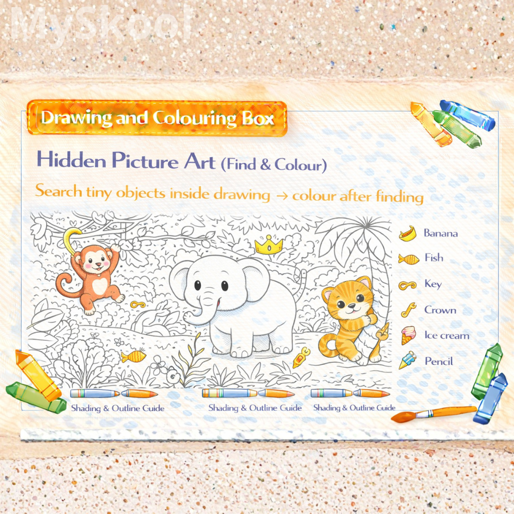 Students scan the artwork carefully. Hidden objects are located. Colours highlight findings. Accuracy is rewarded. Observation skills grow naturally.