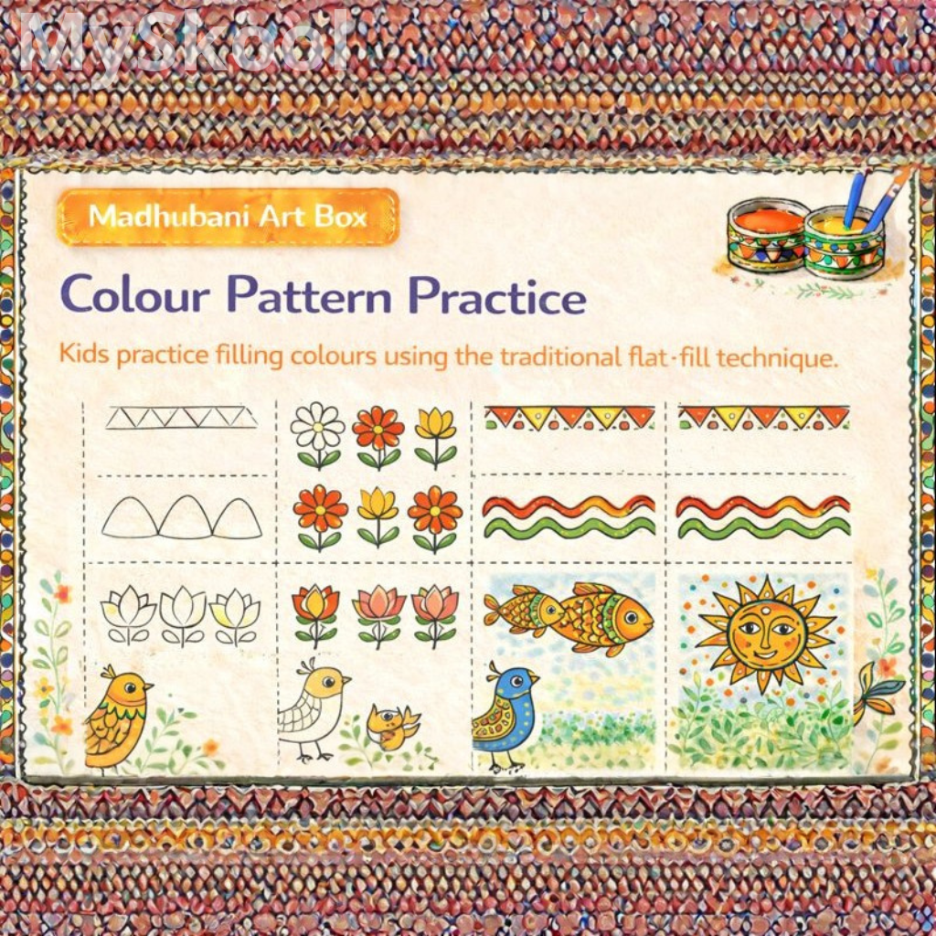 This activity introduces flat colour filling techniques. It improves colour control. Children learn to fill neatly within shapes. The activity builds patience. Traditional style is reinforced.