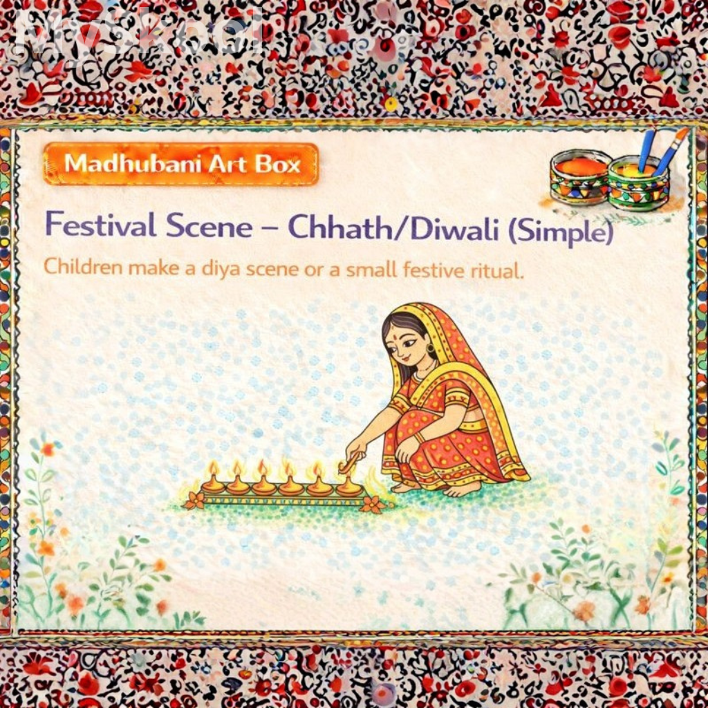 Children draw basic festival elements. Figures and objects are placed carefully. Borders may be added. Colours remain bright. The activity builds cultural connection.