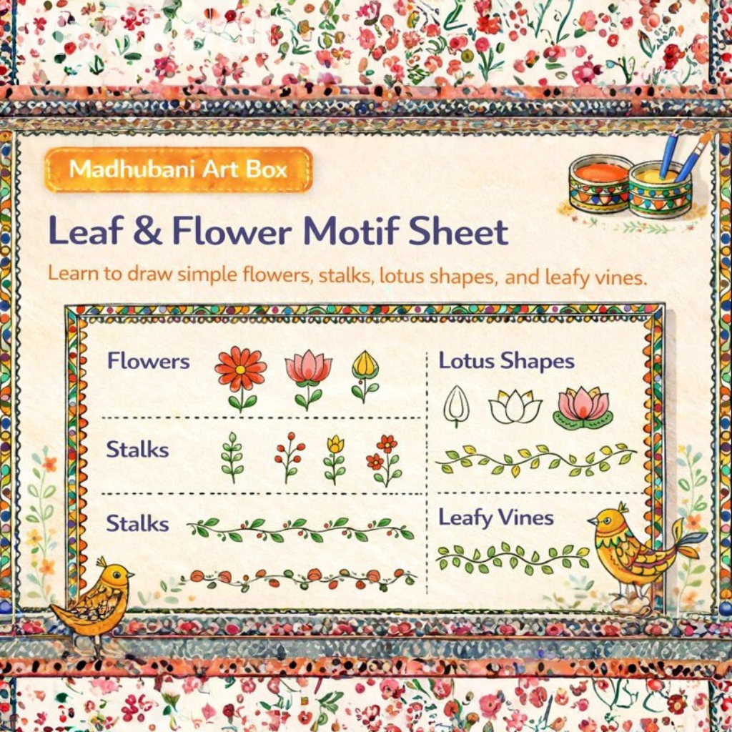 The objective is to introduce natural motifs used in Madhubani art. It improves smooth hand movement and flow. Children learn simple symmetry in leaves and flowers. The activity promotes calm focus. It encourages appreciation of nature.