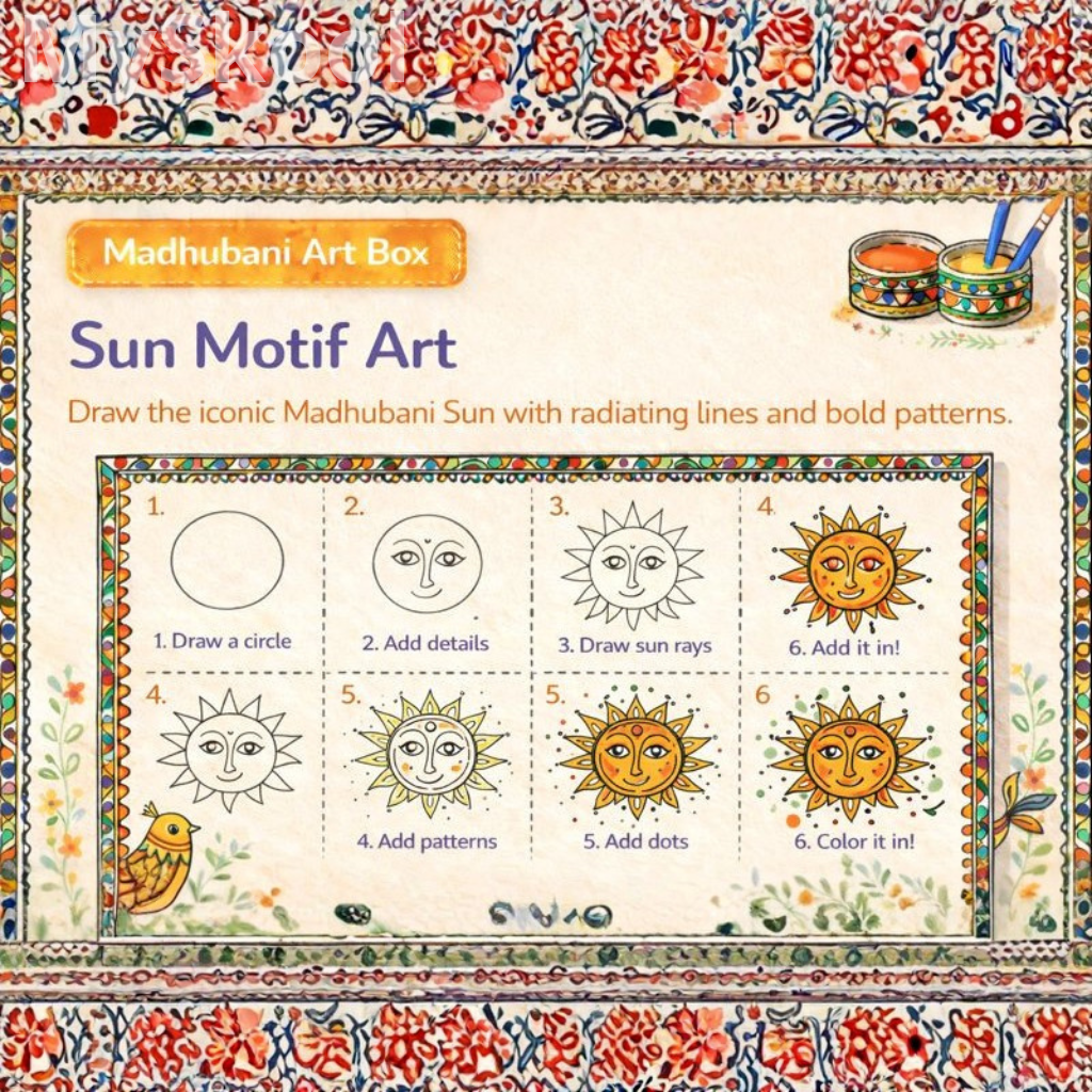 Children will draw a Madhubani sun. They will understand radial balance. Their neatness will improve.