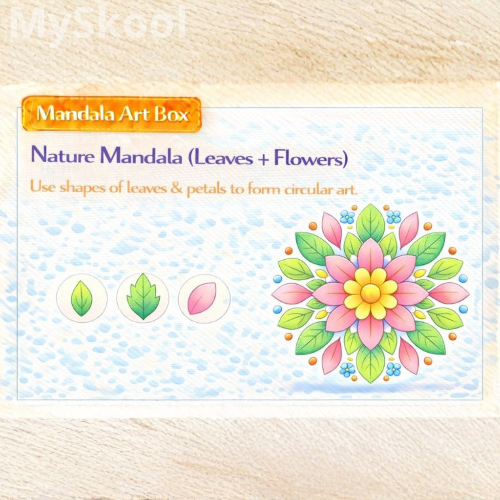 Children draw a circular base. Leaf and petal shapes repeat around it. Patterns stay soft and flowing. Colours reflect nature. The mandala looks soothing.