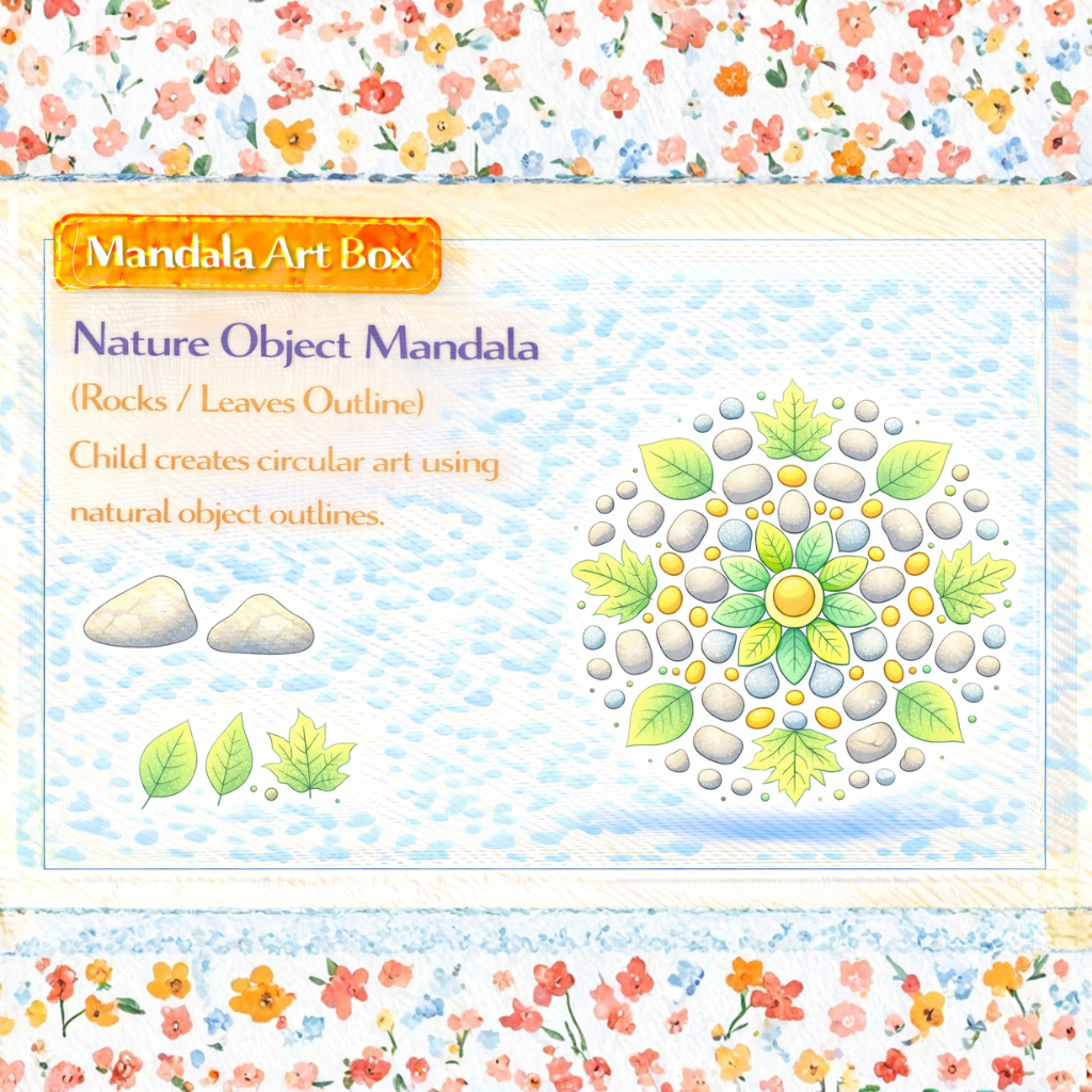 Children trace natural object shapes. Shapes repeat in circular form. Patterns remain organic. Colours stay earthy. The mandala feels grounded.