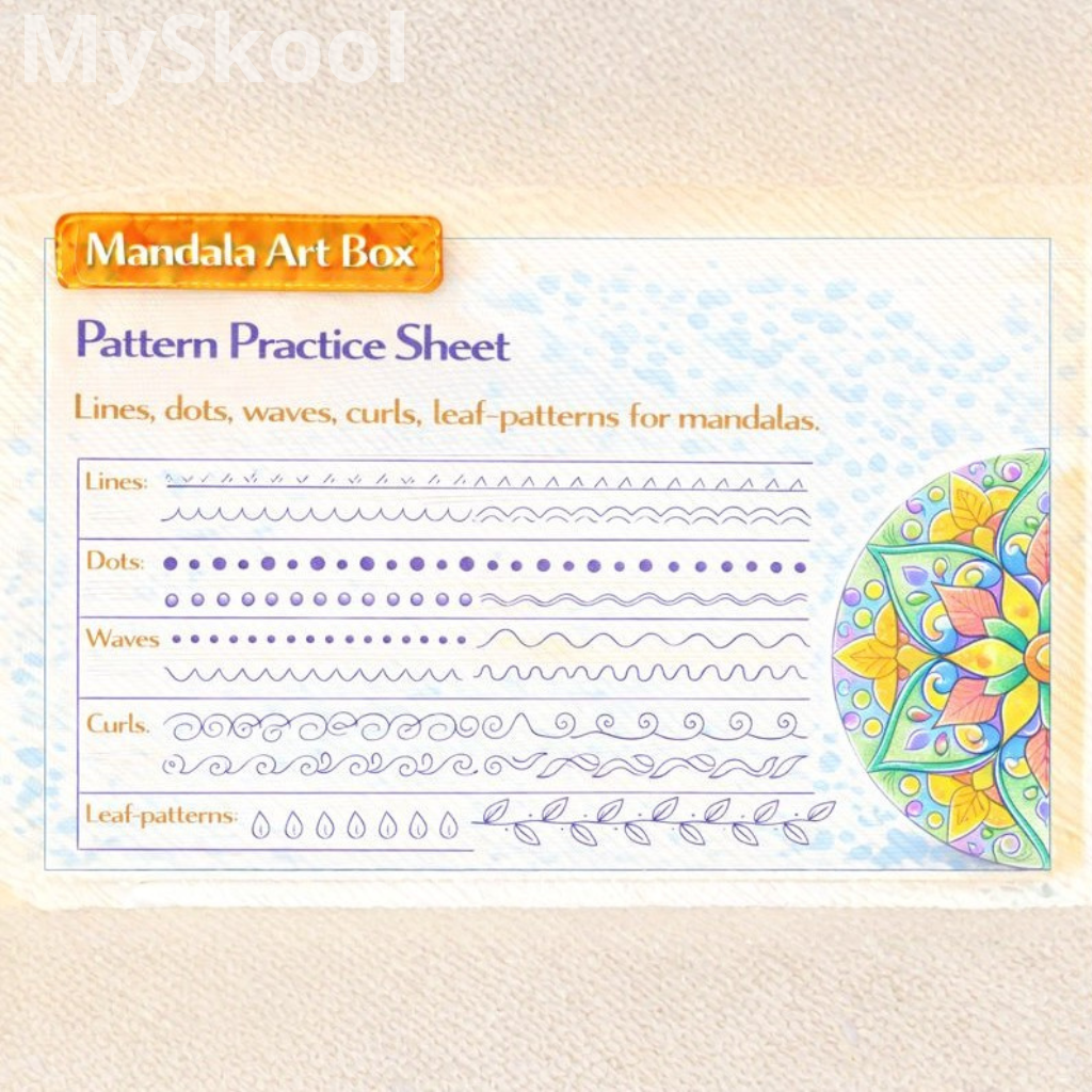 This activity introduces common mandala patterns. It improves line control and repetition skills. Children learn different decorative strokes. The activity builds muscle memory. It prepares children for detailed mandalas.