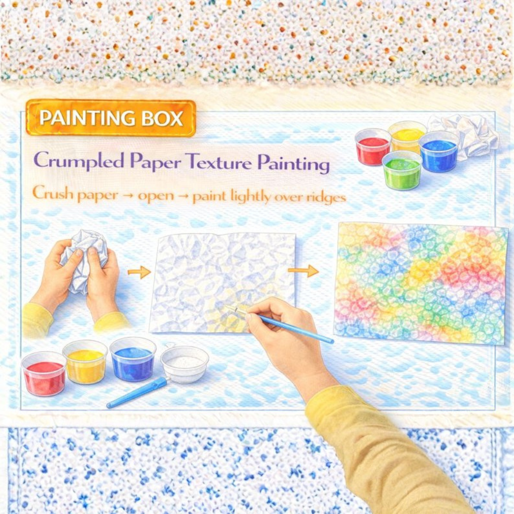 Children crumple paper gently and open it. Paint is brushed lightly over it. Ridges catch the colour. Texture appears naturally. Children observe interesting effects.